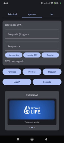 - Carga tu CSV de preguntas/respuestas o configura IA